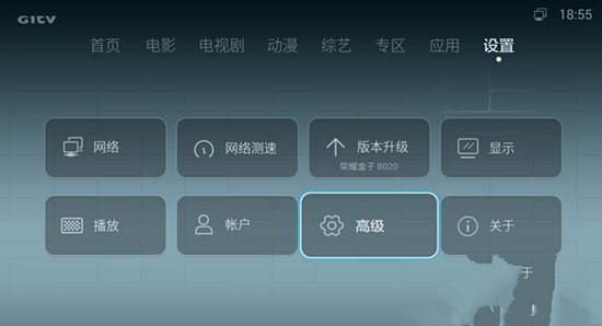 第一步:通电,启动荣耀盒子,进入主界面选择“设置”——“高级”;