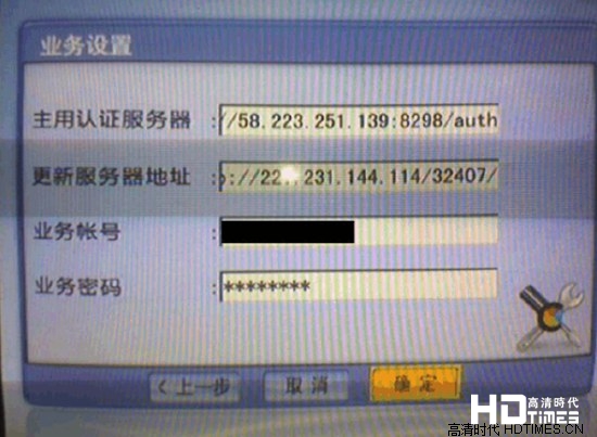 第八步:“认证服务器”、“更新服务器”地址都不要改,业务帐号填入“(区号+您的固话号码)”,业务密码同前页(和您的ADSL宽带帐号密码不一定相同),选“确定”并按“OK”键回到系统设置主菜单;