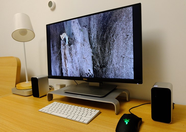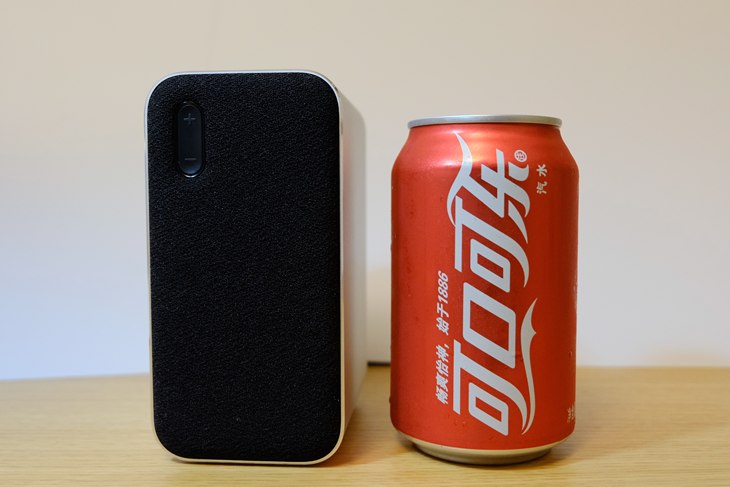 箱体正面的宽度与一罐可乐的宽度类似,高度稍高,放在桌面上十分小巧。单只的尺寸为131×66×90mm。