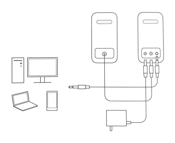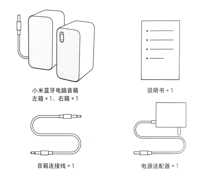 包装中包含左右音箱箱体、说明书、3.5mm音频连接线与电源适配器。其中音频线便于与没有蓝牙功能的电脑等设备进行连接。