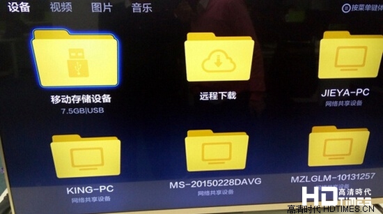 第二步:准备一个U盘(没有U盘可用手机内存卡代替),接着健身将下载下来的第三方软件拷贝到U盘中,然后插到小米电视2 USB接口上,返回小米电视2主界面,点击进入“高清播放器”界面;