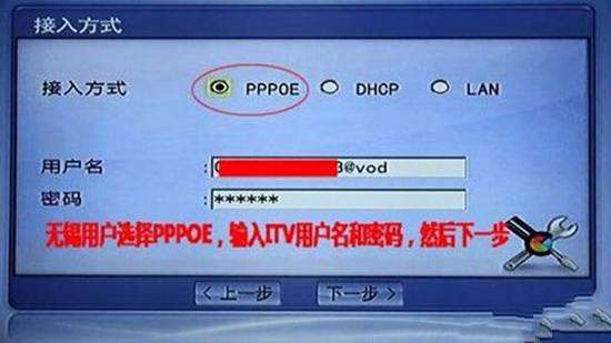 5、下一步,选择PPPOE,输入itv拨号账号和密码。