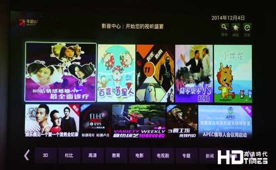 在配置上,土豆智能投影搭载有Cortex-A9处理器、MALI-400 GPU、1GB RAM、4GB ROM、系统为土豆定制Android 4.2操作系统,运行起来还是非常流畅的。不过,由于广电的政策问题,虽然在你打开投影机后,看到主界面的布局与之前基本一致,但是其中土豆的视频内容全部更替为了华数TV的内容。