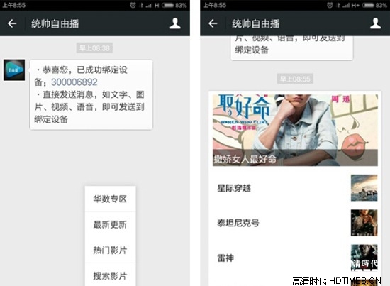 所谓的自由播,即通过智能手机扫描二维码,关注微信公众号实现华数节目内容的搜索、预下载、点播、远程遥控等功能,以打造沉浸式观影体验,解决家中老人和儿童不会使用复杂遥控器的问题,而且彻底弥补了传统智能电视片源少、缺交互的短板,方便老人、儿童等人群。